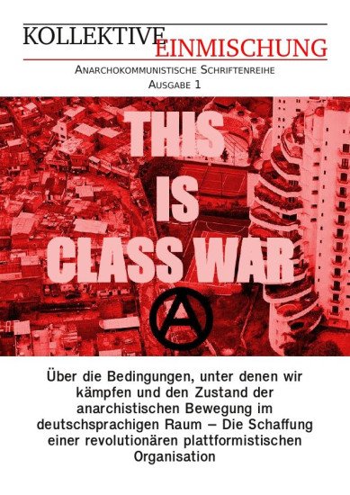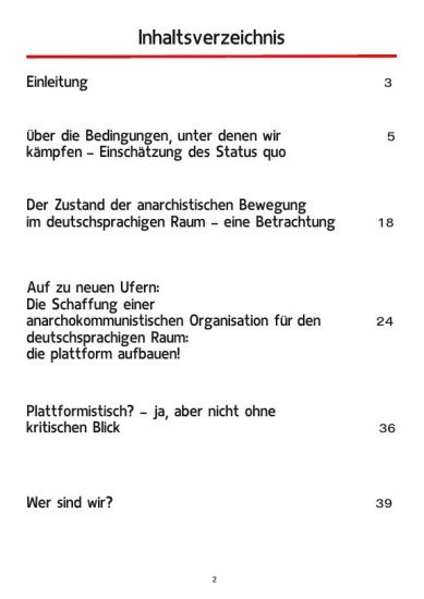 Du hälst hier den ersten öffentlichen Text von »der plattform« in den Händen. Der Text beinhaltet eine kurze Analyse des Bestehenden: »Über die Bedingungen, unter denen wir kämpfen – Einschätzung des Status Quo«. Eine Betrachtung des »Zustandes der anarchistischen Bewegung im deutschsprachigen Raum«. Sowie einen neuen Organisationsvorschlag: »Die Schaffung einer anarchokommunistischen Organisation für den deutschsprachigen Raum: die plattform aufbauen!«